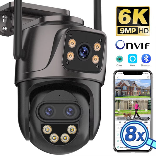 6K 9MP HD IP Camera Outdoor Three-Lens External Wifi Camera 4K/2K Dual Screen Security PTZ Cam Auto Tracking Surveillance Icsee